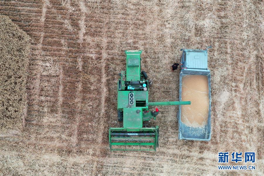 6月2日,在河南省黃泛區(qū)農(nóng)場(chǎng)九分場(chǎng)的麥田里,農(nóng)民操作大型收割機(jī)收獲小麥(無(wú)人機(jī)照片)。