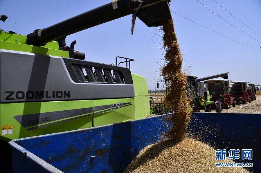 6月3日,在汶上縣郭倉鎮(zhèn),收割機在收獲小麥。目前,我國第二大小麥主產區(qū)山東6000多萬畝小麥進入收獲階段。農民們搶抓有利天氣,自南向北陸續(xù)開鐮。新華社記者郭緒雷攝。