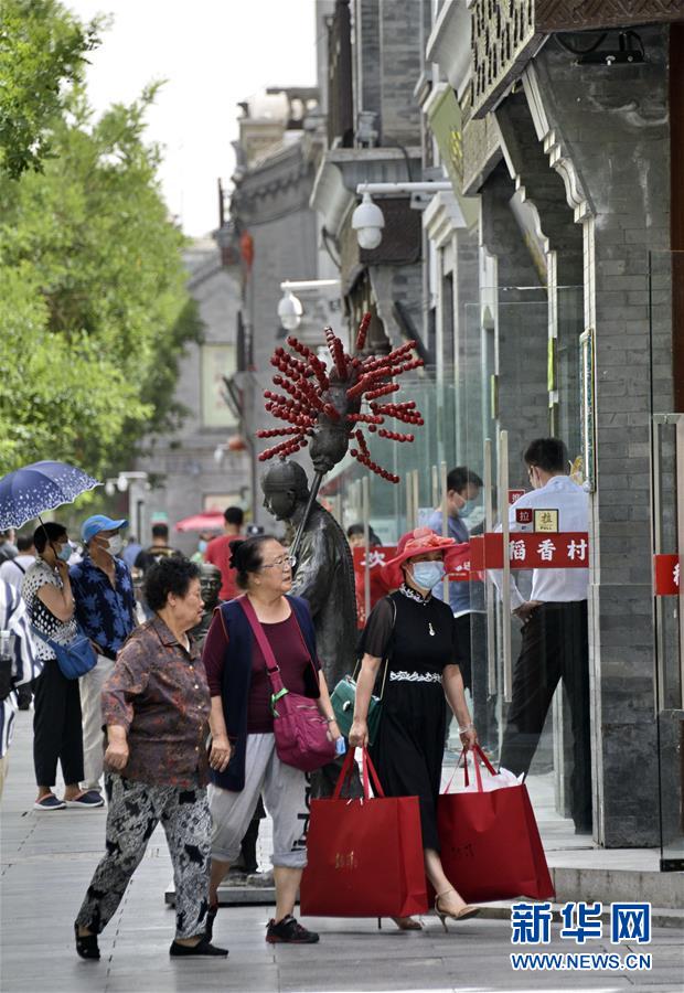 6月3日,市民及游客行走在前門步行街。近日,游人和市民紛紛來到北京市的王府井、西單、前門大街等著名商業(yè)街購物休閑,這些老商業(yè)街開始逐步恢復昔日的繁華。新華社記者李欣攝。