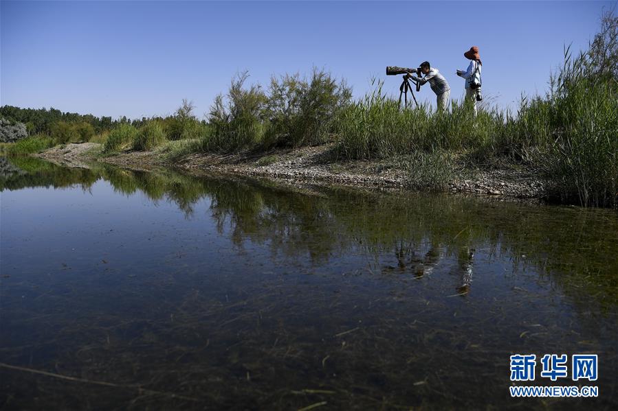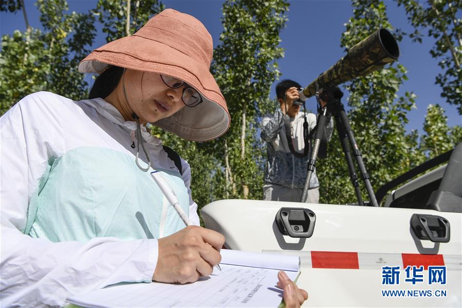 6月3日,李學(xué)明(左)和同事張海榮在監(jiān)測(cè)記錄黃河濕地的鳥類活動(dòng)。新華社記者馮開華攝。