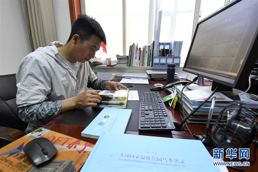 6月3日,李學(xué)明在學(xué)習(xí)鳥類知識(shí)。新華社記者馮開華攝。