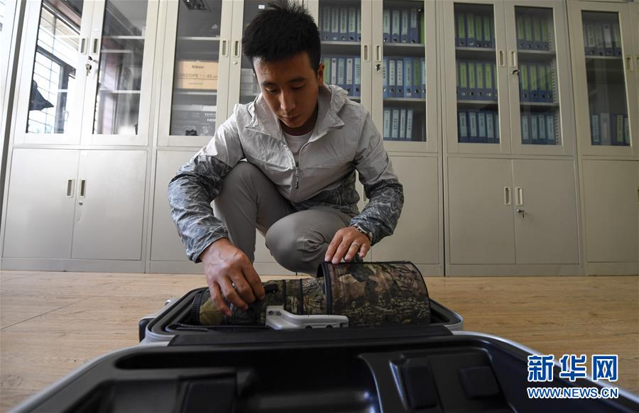6月3日,李學(xué)明在整理設(shè)備,準(zhǔn)備開始當(dāng)天的巡護(hù)監(jiān)測(cè)工作。新華社記者馮開華攝。