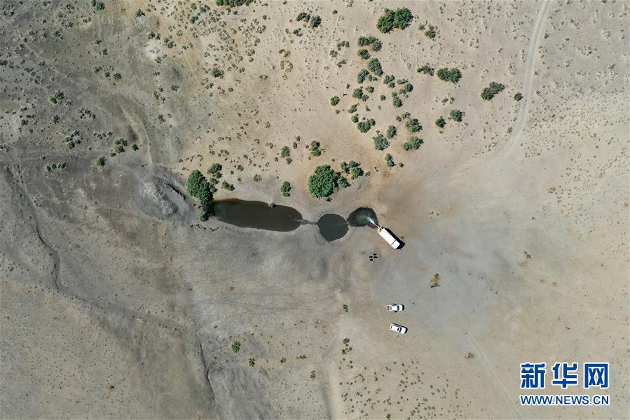 在新疆卡拉麥里山有蹄類(lèi)野生動(dòng)物自然保護(hù)區(qū),管護(hù)員為水源地灌水(6月3日攝,無(wú)人機(jī)照片)。新華社記者丁磊攝。