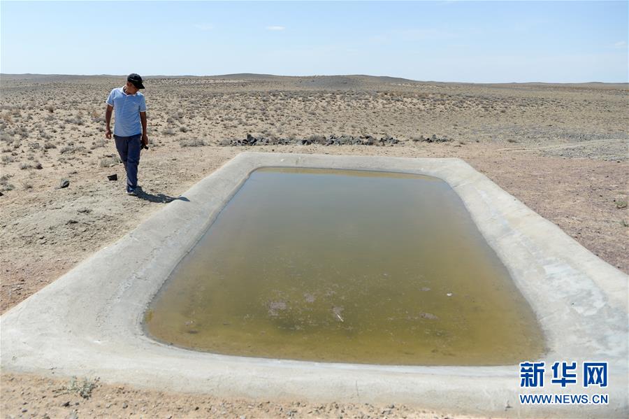 在新疆卡拉麥里山有蹄類(lèi)野生動(dòng)物自然保護(hù)區(qū),管護(hù)員阿達(dá)比亞特來(lái)到人工建設(shè)的水池查看蓄水情況(6月3日攝)。新華社記者丁磊攝。