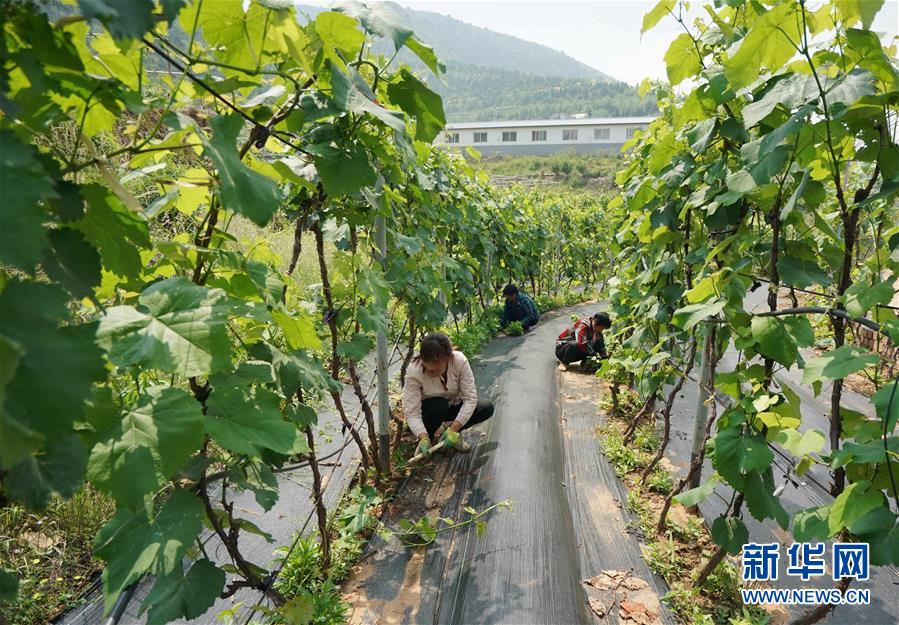 6月4日,唐山市豐潤區(qū)火石營鎮(zhèn)趙莊子村百草坡農(nóng)產(chǎn)品農(nóng)民專業(yè)合作社社員在生態(tài)農(nóng)業(yè)園給葡萄藤除草。新華社記者郭雅茹攝。