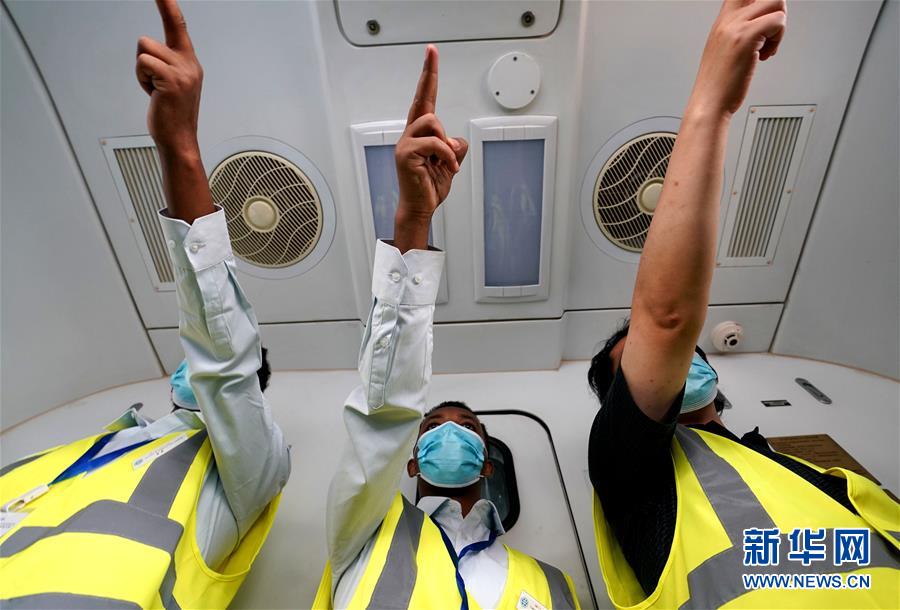 6月5日,實習(xí)指導(dǎo)教師帶領(lǐng)伊迪內(nèi)卡邱(中)和特瑞薩(左)練習(xí)標準化一次乘務(wù)作業(yè)。 新華社記者 李安 攝