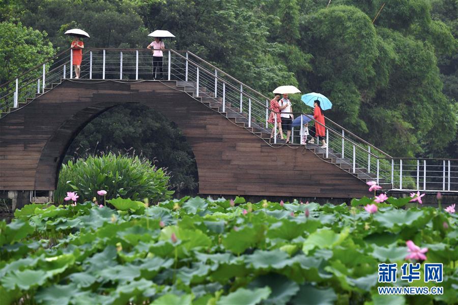 6月7日,一陣小雨過后,福州金山公園內(nèi)盛開的荷花愈加嬌艷欲滴,吸引市民前來游覽。新華社記者姜克紅攝