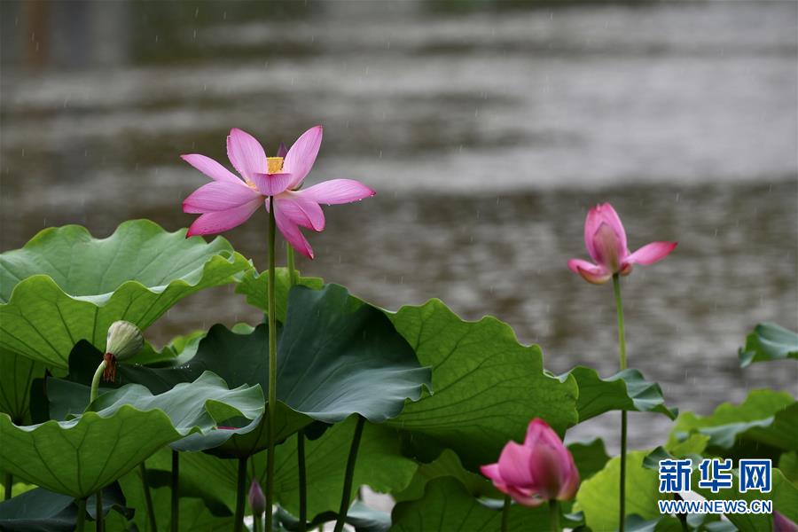 6月7日,一陣小雨過后,福州金山公園內(nèi)盛開的荷花愈加?jì)善G欲滴。新華社記者姜克紅攝