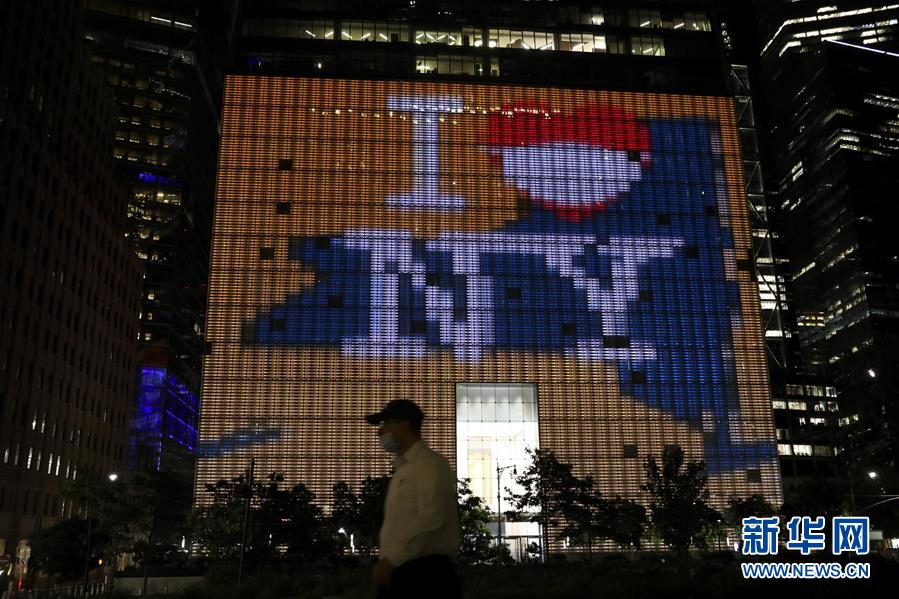6月7日,美國紐約世貿(mào)中心一號樓外墻呈現(xiàn)出“我愛紐約”字樣。當(dāng)日,紐約州多處建筑點亮藍色和金色燈光,及用燈光效果呈現(xiàn)出“紐約堅強”、“我愛紐約”等字樣,致敬紐約民眾團結(jié)抗擊疫情。新華社記者王迎攝