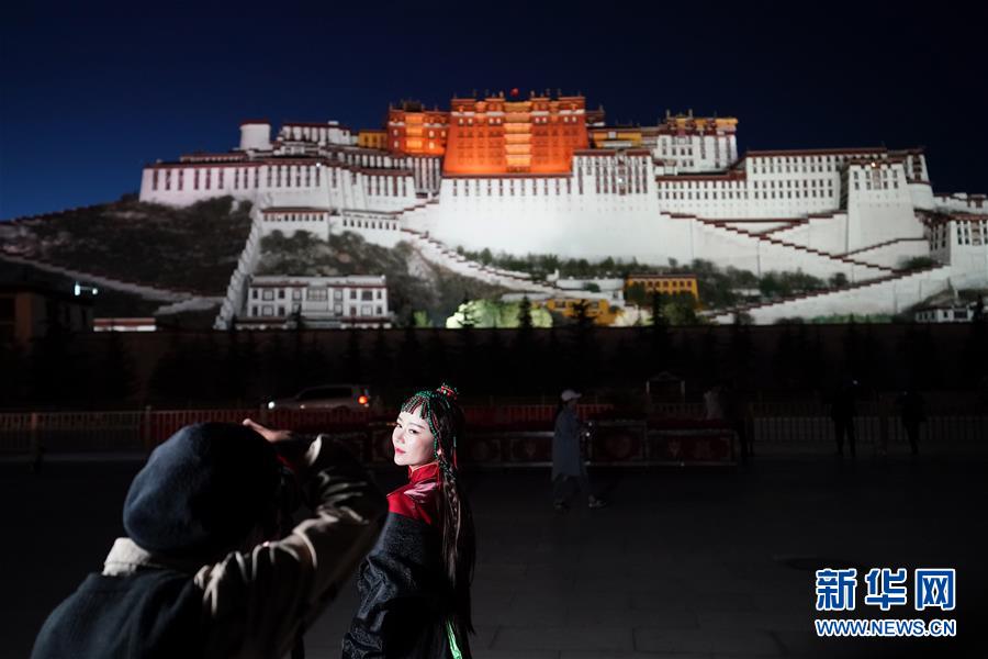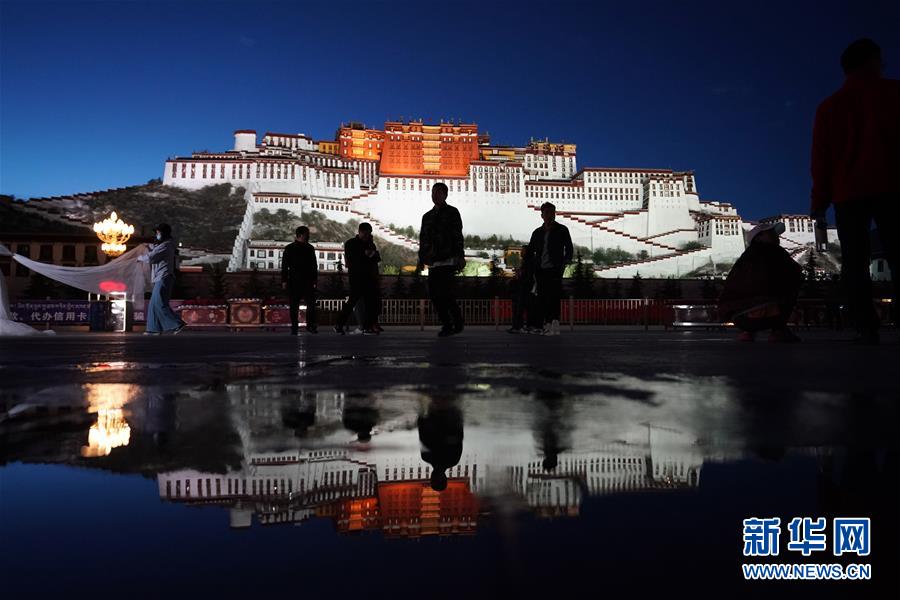 人們在布達(dá)拉宮廣場拍照(6月8日攝)。夜幕降臨,西藏拉薩布達(dá)拉宮燈光璀璨,夜景迷人。新華社記者詹彥攝