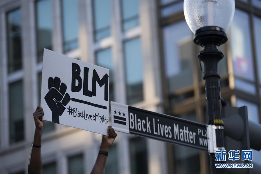 6月8日,一名男子在美國(guó)華盛頓白宮附近手舉“黑人的命也是命”的抗議標(biāo)語(yǔ)。新華社記者劉杰攝