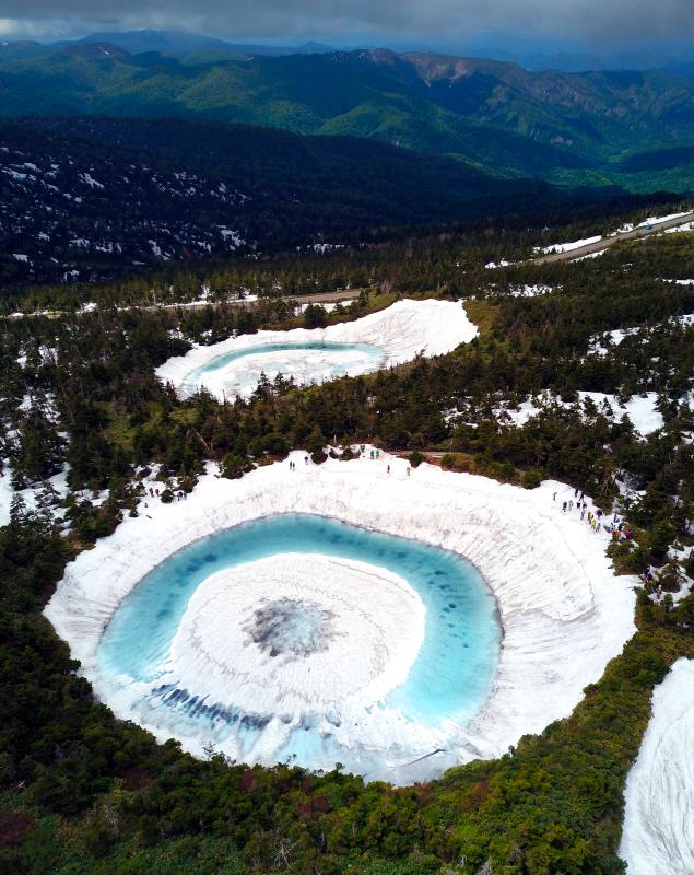 當(dāng)?shù)貢r(shí)間2020年6月8日,日本,在橫跨巖手縣與秋田縣的八幡平山頂附近的“鏡沼”,伴隨著“鏡沼”的積雪從外側(cè)逐漸融化,外圍的碧藍(lán)色湖水與中心部的潔白積雪相映成趣,呈現(xiàn)出獨(dú)特的類似“龍眼”的景象。據(jù)悉,八幡平“龍眼”奇景只在每年5月下旬至6月初的雪融期間短暫出現(xiàn)。
