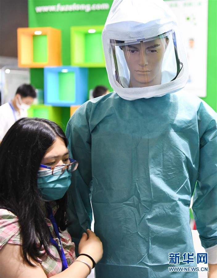 6月10日,參展工作人員在整理防護服產(chǎn)品。當日,廣州國際防疫物資展覽會在保利世貿(mào)博覽館舉行。本次展會面積共計3.6萬平方米,設(shè)有防疫產(chǎn)品、設(shè)備、綜合服務(wù)、原輔料等4個展區(qū),參展企業(yè)約600家。新華社記者鄧華攝