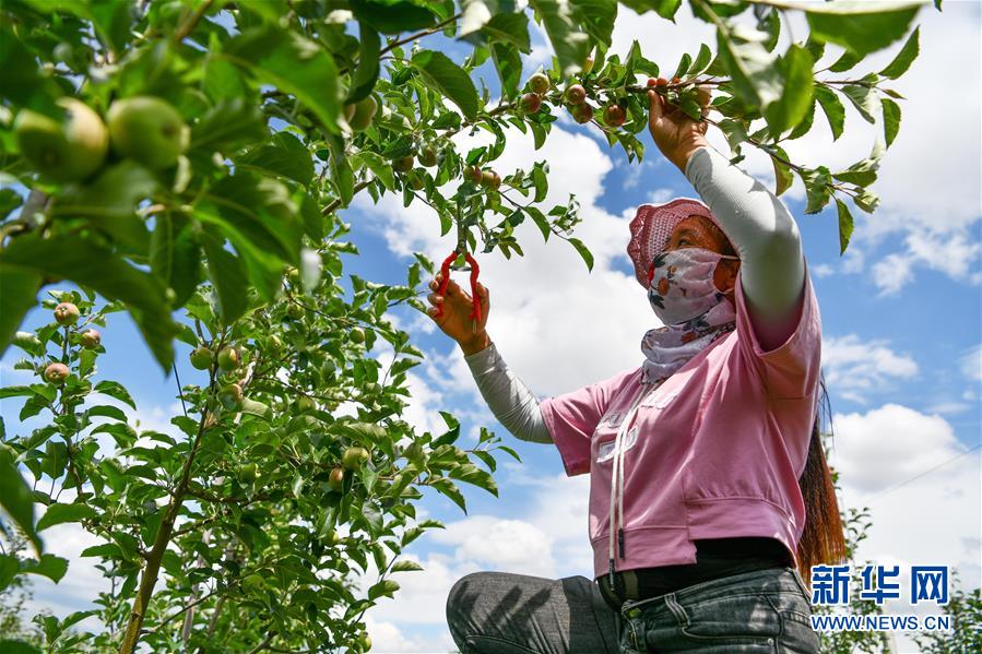 6月11日,農(nóng)民在貴州省威寧縣一處蘋果基地里疏果。近日,貴州省威寧彝族回族苗族自治縣的農(nóng)民搶抓農(nóng)時(shí),對(duì)蘋果園進(jìn)行疏果、除草等田間管理,呈現(xiàn)出一派夏管農(nóng)忙景象。威寧縣蘋果種植面積50余萬畝,蘋果產(chǎn)業(yè)已逐步成為當(dāng)?shù)剞r(nóng)民增收致富的主導(dǎo)產(chǎn)業(yè)之一。新華社記者楊文斌攝。