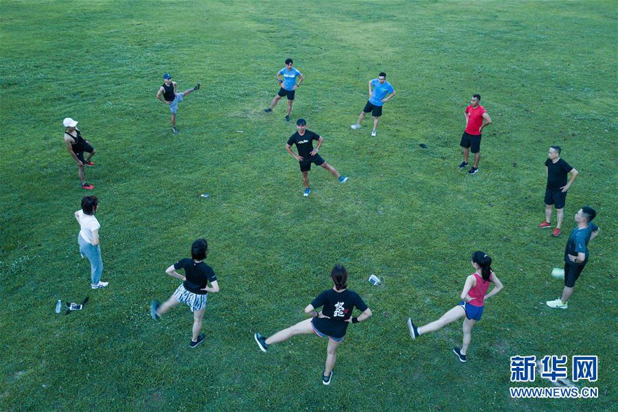 6月11日傍晚,在??谌f綠園,市民在夜跑前做熱身運(yùn)動(無人機(jī)拍攝)。近年來,夜跑成為越來越多都市人熱衷的健身方式之一。在海南??冢慨?dāng)夜幕降臨,“夜跑族”來到??谌f綠園、世紀(jì)公園等夜跑場所跑步,用一身酣暢淋漓的汗水?dāng)[脫白天工作中的壓力,享受跑步帶來的歡愉。新華社記者 蒲曉旭 攝