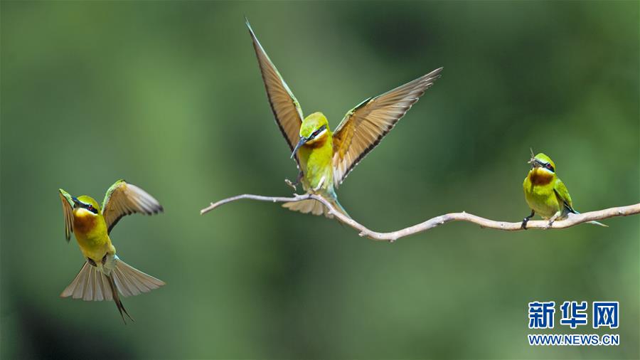 栗喉蜂虎在福建省晉江市深滬鎮(zhèn)科任村一山坡上覓食嬉戲(6月12日攝)。入夏以來,逾百只栗喉蜂虎飛臨閩南晉江市深滬鎮(zhèn)科任村筑巢棲息。新華社記者記者梅永存攝。