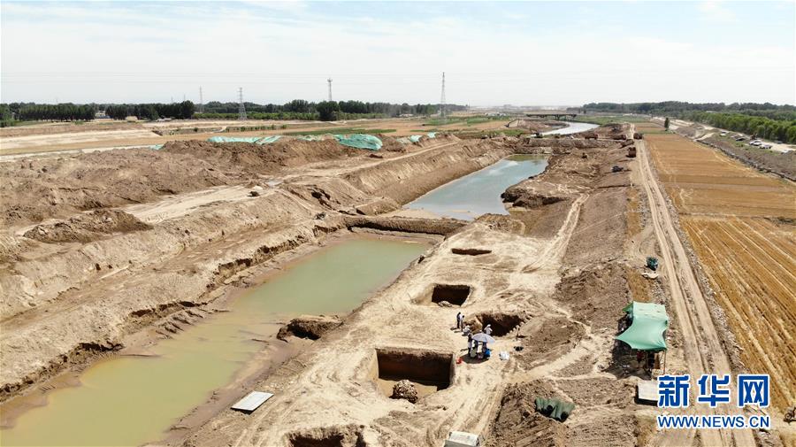 這是6月14日拍攝的山東小清河章丘段考古發(fā)掘現(xiàn)場(無人機照片)。近日,濟南市考古研究所考古工作隊在對小清河章丘段進行考古調(diào)查和勘探時,發(fā)現(xiàn)了13座年代集中在北朝末期至唐朝初期的古墓。新華社記者 王凱 攝
