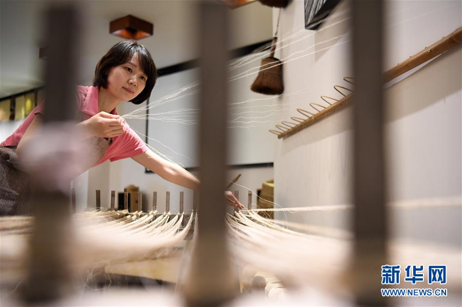 6月12日,在重慶榮昌的天運(yùn)夏布會館,非遺傳承人馬琳沁在展示傳統(tǒng)夏布生產(chǎn)工藝——牽線。新華社記者 唐奕 攝