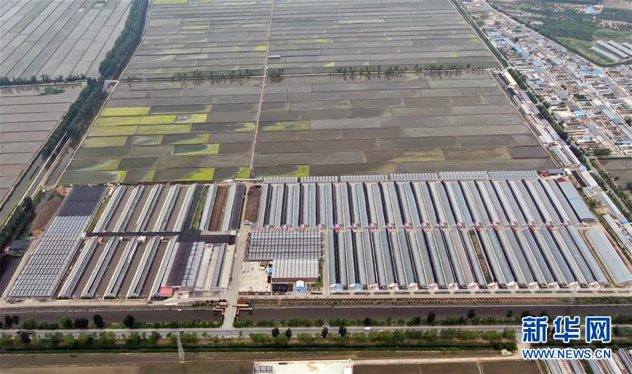 在遼寧省盤錦市大洼區(qū)新興鎮(zhèn)拍攝的劉廣會(huì)經(jīng)營(yíng)的現(xiàn)代化育苗大棚(6月9日攝,無人機(jī)照片)。新華社記者 楊青 攝