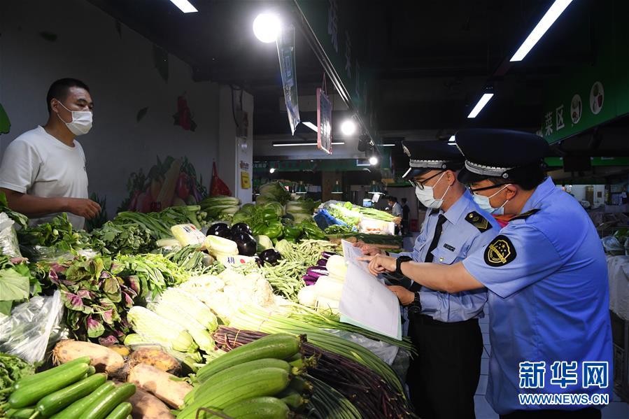 6月17日,在位于北京市海淀區(qū)的增光鴻運(yùn)市場(chǎng),執(zhí)法人員對(duì)商戶(hù)所售蔬菜的進(jìn)貨渠道進(jìn)行檢查。新華社記者 任超 攝