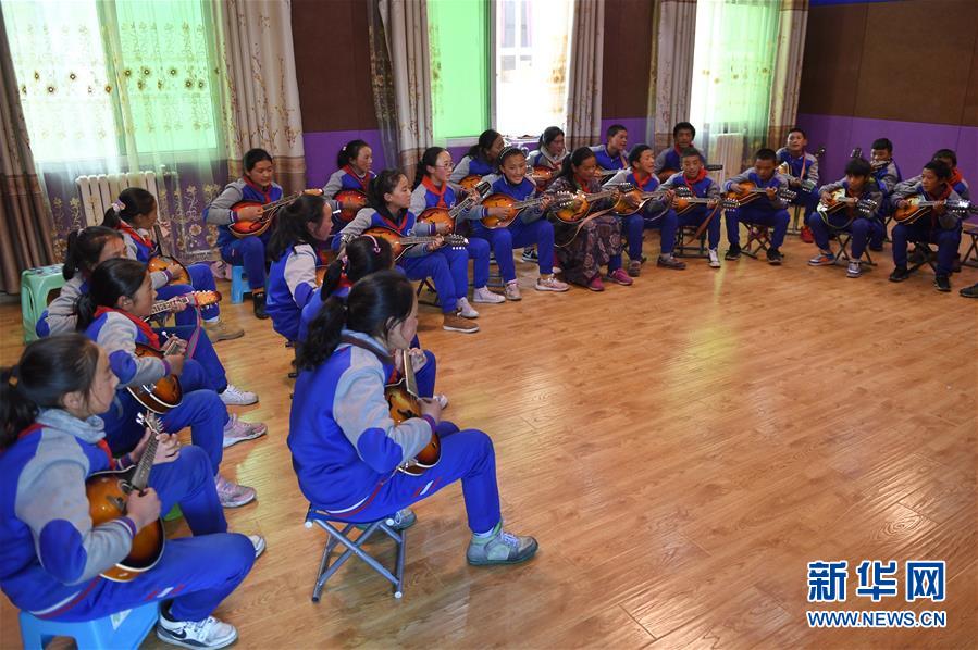 6月14日,孩子們?cè)诎慰h民族寄宿制小學(xué)內(nèi)的少年宮里用曼陀鈴進(jìn)行彈唱。新華社記者 劉坤 攝