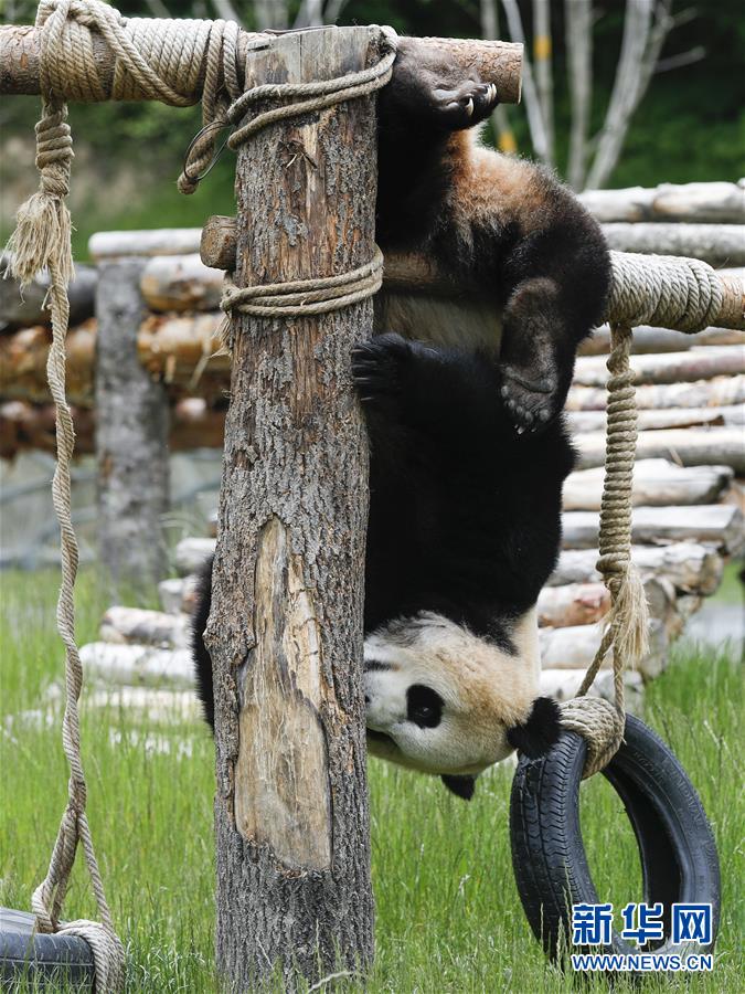 在位于四川省阿壩藏族羌族自治州的九寨溝大熊貓園,大熊貓“新新”在玩耍(6月19日攝)。新華社記者沈伯韓攝