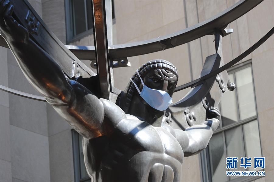 6月22日,在美國(guó)紐約洛克菲勒中心,一座雕像被“戴”上口罩。美國(guó)約翰斯·霍普金斯大學(xué)22日發(fā)布的新冠疫情最新統(tǒng)計(jì)數(shù)據(jù)顯示,美國(guó)累計(jì)死亡病例超過(guò)12萬(wàn)例。新華社記者王迎攝