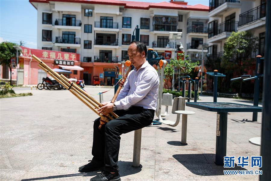在貴州省惠水縣明田街道易地扶貧搬遷項目新民社區(qū),居民羅應(yīng)和在新居旁吹蘆笙(5月6日攝)。新華社記者歐東衢攝