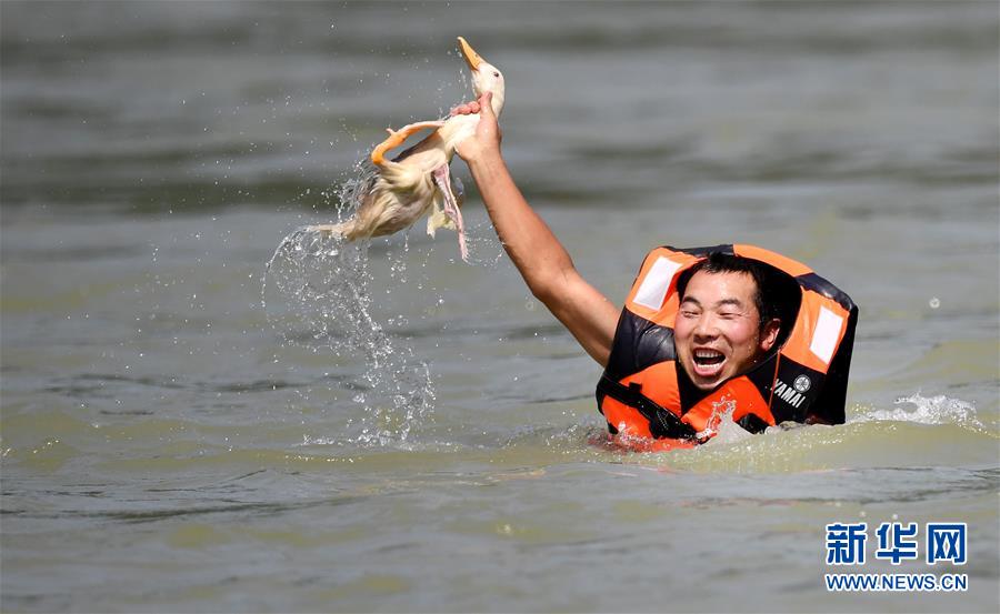 6月25日,參賽選手將放歸漢江中的鴨子抓到手中,鉆出水面,舉過(guò)頭頂,引來(lái)岸上一片歡呼。龍舟賽最引人注目的是搶鴨子、抓鯉魚(yú)。新華社記者 陶明 攝