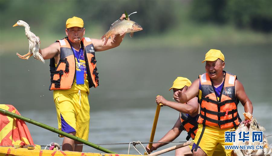 6月25日,參賽選手將放歸漢江中的鴨子、鯉魚(yú)抓到手中,引來(lái)岸上一片歡呼。新華社記者 陶明 攝