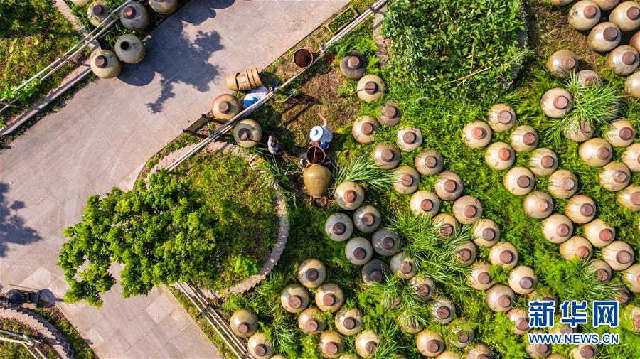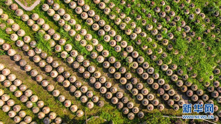 赤水曾氏曬醋廠晾曬的醋壇(6月26日攝,無(wú)人機(jī)照片)?!俺嗨畷翊住辈捎霉腆w發(fā)酵繁殖產(chǎn)生天然醋酸菌,醋醅和成品醋都在日光下曝曬而成,故稱(chēng)曬醋。“赤水曬醋”制作歷史悠久,工序考究,2009年被列入貴州省級(jí)非遺名錄。新華社記者 陶亮 攝