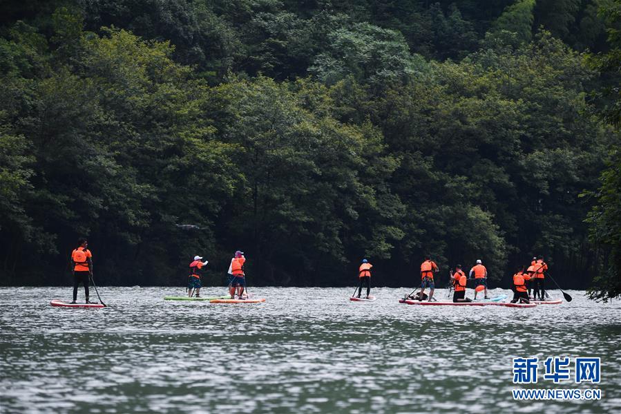6月28日,水上運(yùn)動愛好者在杭州市富陽區(qū)湖源鄉(xiāng)的壺源溪上體驗(yàn)槳板運(yùn)動的樂趣。近期,浙江省杭州市富陽區(qū)場口鎮(zhèn)、常安鎮(zhèn)和湖源鄉(xiāng)組團(tuán)開啟了一場夏季“綠水青山嘉年華”。這幾個(gè)壺源溪流域鄉(xiāng)鎮(zhèn)整合生態(tài)旅游資源,組團(tuán)開發(fā)山村旅游項(xiàng)目,游客可以參與壺源溪水上游樂、露營永安山頂、特色農(nóng)產(chǎn)品集市和瓜果節(jié)等特色活動。新華社記者徐昱攝