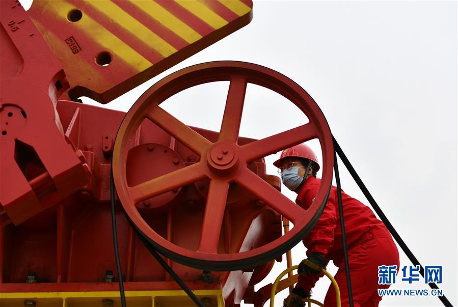 6月29日,馮萌萌在大港油田采油二廠二區(qū)內(nèi)檢查機器皮帶磨損情況。新華社記者李然攝