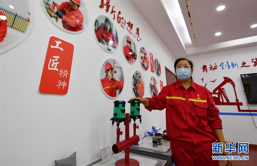 6月29日,馮萌萌在大港油田采油二廠二區(qū)“馮萌萌勞模創(chuàng)新工作室”留影。新華社記者李然攝
