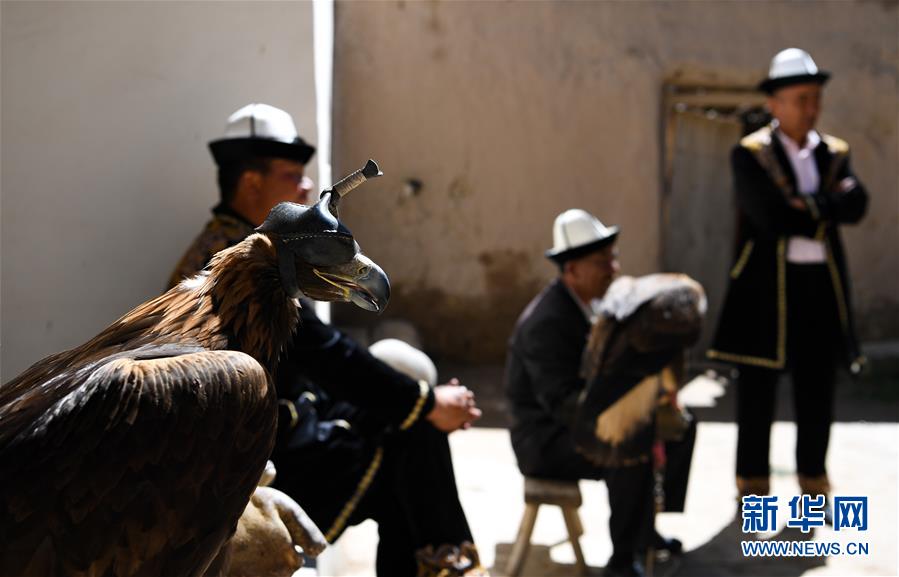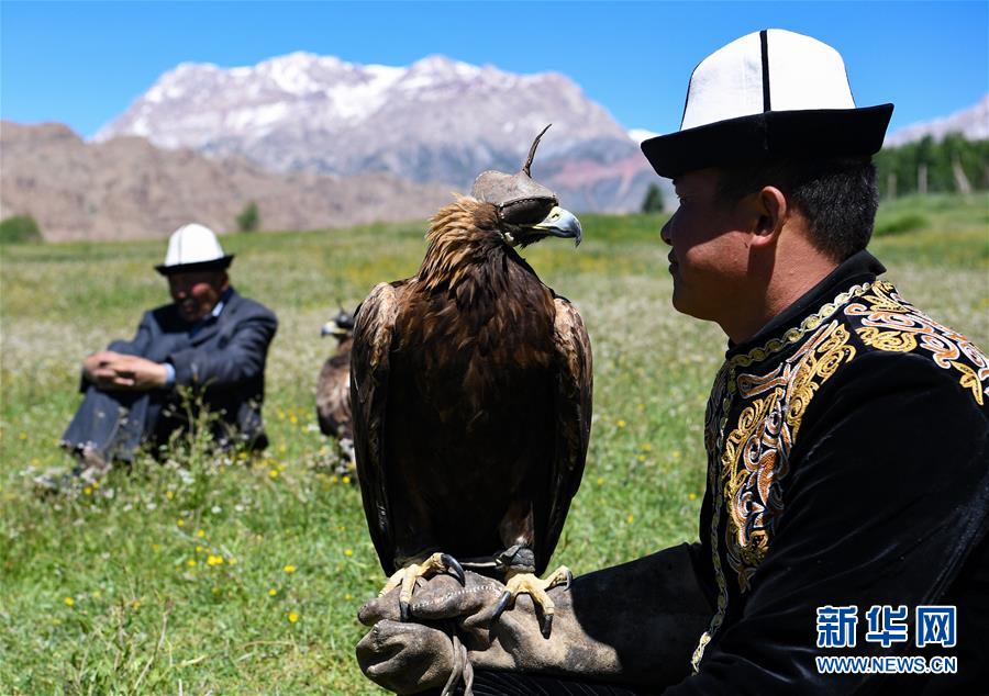 6月29日,庫(kù)爾馬西·胡特曼(右)和他的徒弟們展示獵鷹。新華社記者宋彥樺攝