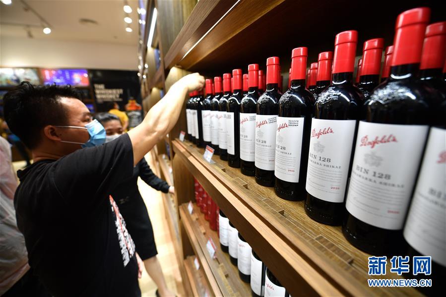 7月1日,顧客在??谌赵聫V場(chǎng)免稅店選購酒類商品。當(dāng)日,海南開始實(shí)施調(diào)整后的離島免稅購物政策。海南離島旅客每年每人免稅購物額度提高至10萬元,電子消費(fèi)產(chǎn)品等7類新增商品開售。新華社記者郭程攝