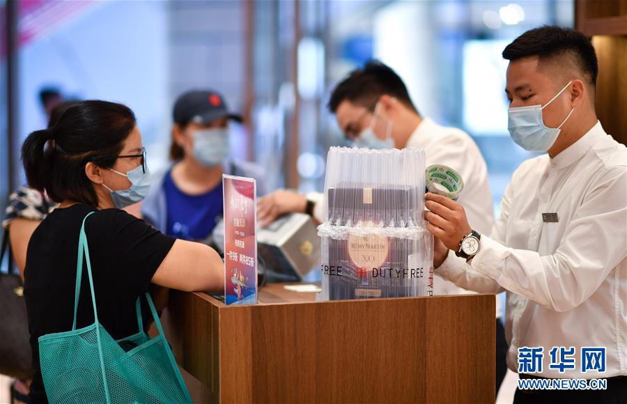 7月1日,??谌赵聫V場(chǎng)免稅店的工作人員為顧客打包酒類商品。當(dāng)日,海南開始實(shí)施調(diào)整后的離島免稅購物政策。海南離島旅客每年每人免稅購物額度提高至10萬元,電子消費(fèi)產(chǎn)品等7類新增商品開售。新華社記者郭程攝