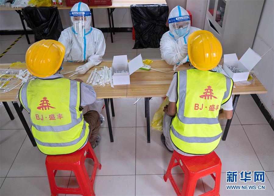 7月2日,在北京市大興區(qū)中建三局二公司北京公司一項(xiàng)目建筑工地的臨時(shí)核酸檢測(cè)采樣點(diǎn),醫(yī)護(hù)人員為建筑工地人員采集咽拭子。新華社記者才揚(yáng)攝