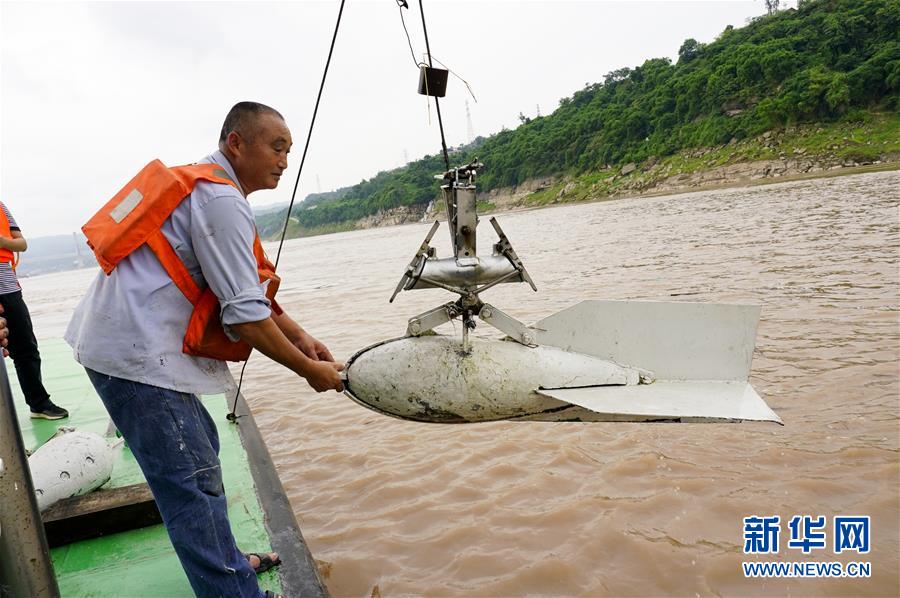 7月2日,在水文作業(yè)船上,長(zhǎng)江清溪場(chǎng)水文站工作人員將水樣采集鉛魚放入水中。
