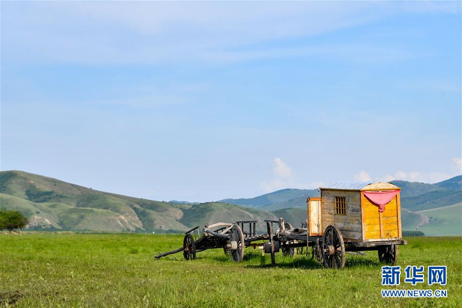 烏蘭毛都草原上的勒勒車(7月1日攝)。盛夏時節(jié),內(nèi)蒙古興安盟科爾沁右翼前旗的烏蘭毛都草原綠意盎然,風(fēng)景醉人。烏蘭毛都草原地處大興安嶺南麓,屬丘陵山地草原,風(fēng)光獨(dú)特。新華社記者貝赫攝