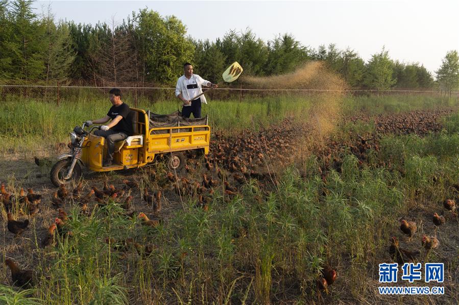 7月1日,在黑龍江省五大連池市的草原上,桑慶軍在拋撒飼料喂雞。新華社記者謝劍飛攝