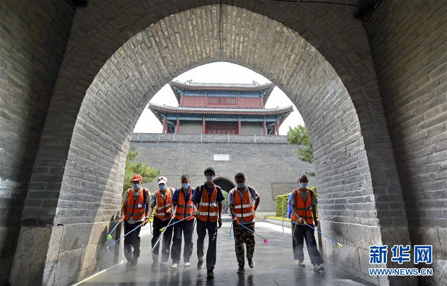 7月4日,防疫人員在宛平古城進行環(huán)境消毒。當(dāng)日,北京市豐臺區(qū)組織防疫人員、安全監(jiān)察部門人員對社區(qū)、超市、公共場所進行大規(guī)模環(huán)境消毒及疫情隱患排查,全力保障市民生活和工作環(huán)境安全。新華社記者 李欣 攝
