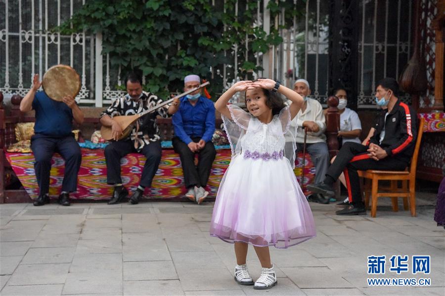 在烏魯木齊大巴扎景區(qū),小朋友跟著音樂(lè)起舞(7月4日攝)。夏日周末,烏魯木齊市大巴扎景區(qū)內(nèi)熙熙攘攘,人們來(lái)到這里品嘗美食、休閑購(gòu)物。2018年,經(jīng)過(guò)靚化改造后的大巴扎景區(qū)新增長(zhǎng)約800米的步行街,分為文創(chuàng)文旅和“非遺”項(xiàng)目街區(qū)、國(guó)際時(shí)尚街區(qū)和大巴扎美食街區(qū),是烏魯木齊最受歡迎的旅游目的地之一。新華社記者丁磊攝