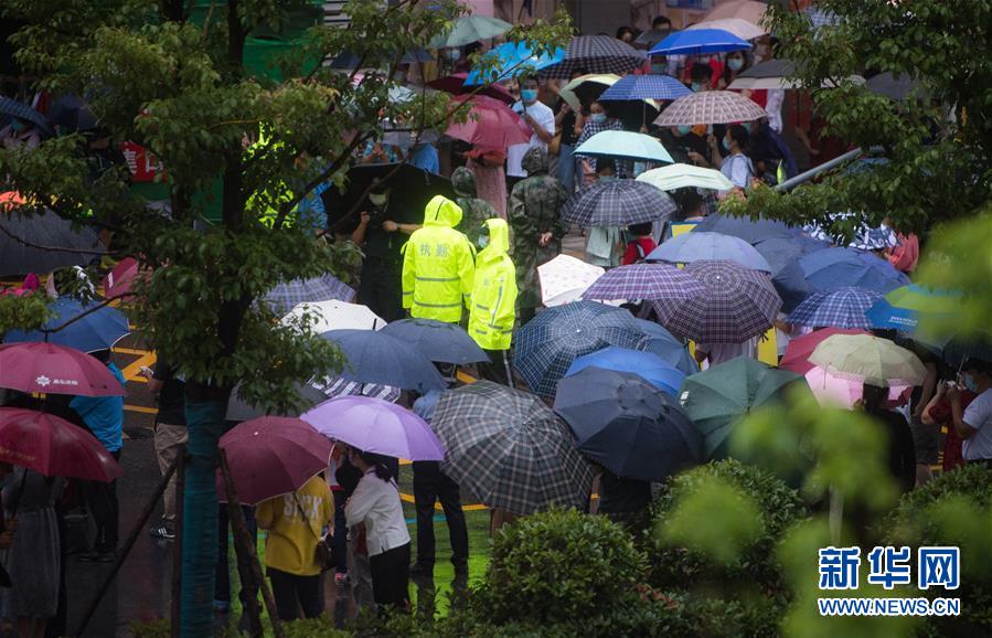 7月7日,在湖北省武漢市東湖中學(xué)考點外,民警在雨中執(zhí)勤。當(dāng)日,2020年高考拉開帷幕。新華社記者肖藝九攝