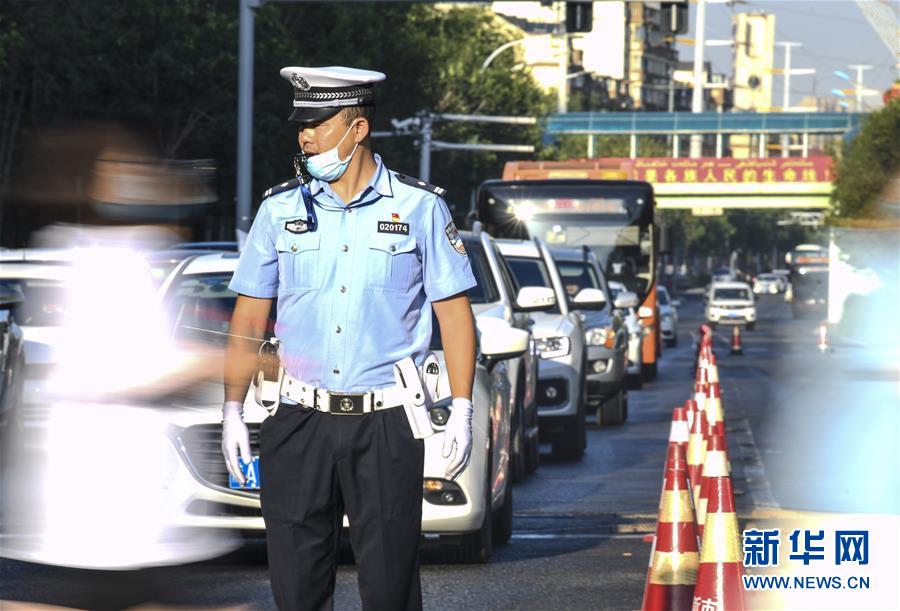 7月7日,在烏魯木齊市第六十八中學(xué)考點外,烏魯木齊市公安局交通警察支隊新市區(qū)大隊阿勒泰路中隊中隊長謝建明在引導(dǎo)考生通過馬路。當(dāng)日,2020年高考拉開帷幕。新華社記者王菲攝