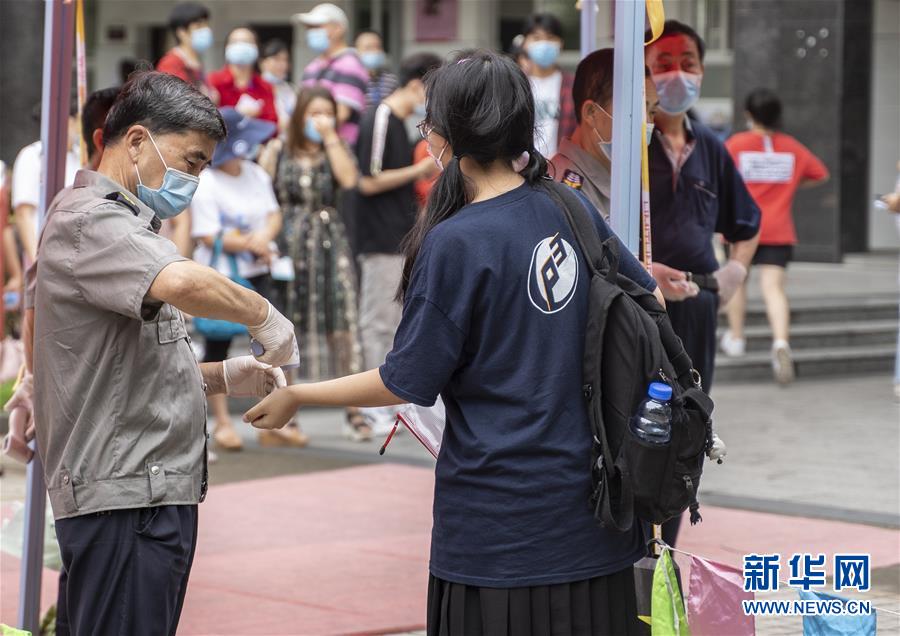 7月7日,江西省南昌市豫章中學(xué)考點工作人員為考生測量體溫。當(dāng)日,2020年高考拉開帷幕。新華社記者張浩波攝