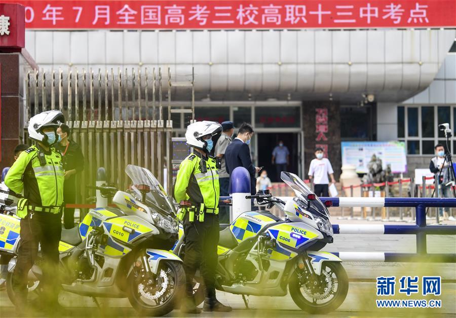 7月7日,在烏魯木齊市第十三中學(xué)考點外,烏魯木齊市公安局交通警察支隊特勤大隊昆侖鐵騎騎警孟凡超(右)與梁劍在執(zhí)勤。當(dāng)日,2020年高考拉開帷幕。新華社記者王菲攝