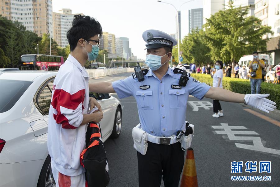 7月7日,在位于北京的中國(guó)人民大學(xué)附屬中學(xué)考點(diǎn)外,北京市公安局公安交通管理局海淀交通支隊(duì)中關(guān)村大隊(duì)交警殷宏偉(右)指揮前來(lái)送考生的車輛有序停好,引導(dǎo)考生迅速前往考點(diǎn)。當(dāng)日,2020年高考拉開帷幕。新華社記者沈伯韓攝