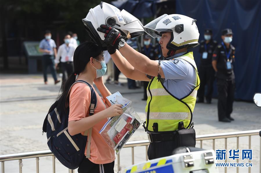 7月7日,在安徽省合肥市五十中學(xué)天鵝湖校區(qū)考點(diǎn),交警將快要遲到的考生送到考場(chǎng)。當(dāng)日,2020年高考拉開(kāi)帷幕。新華社記者周牧攝