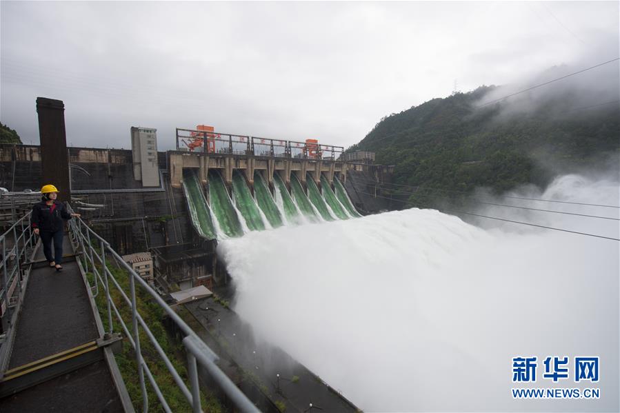 7月8日,新安江水庫(kù)開(kāi)啟9孔泄洪,工作人員在新安江電廠開(kāi)關(guān)站上進(jìn)行設(shè)備巡查。新華社記者翁忻旸攝